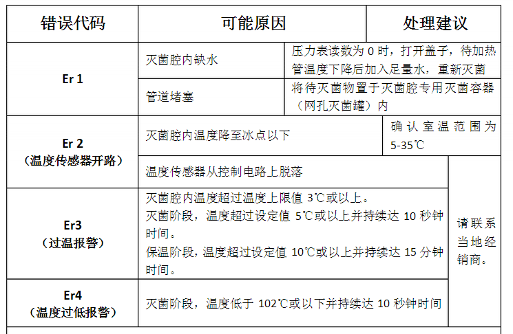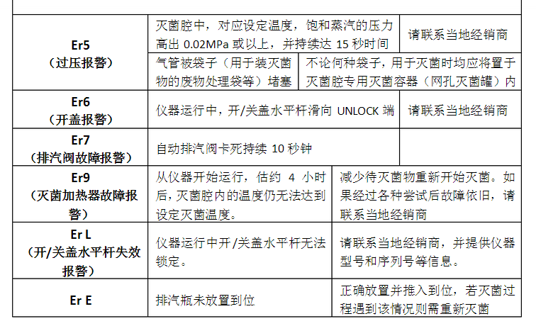功能異常時,錯誤檢測電路將觸發(fā)以確保安全。電路激活時,錯誤代碼在顯示屏顯示并聲音報警。按START/STOP鍵可停止報警聲。報警情況發(fā)生時,檢查錯誤代碼,并關(guān)閉儀器電源。