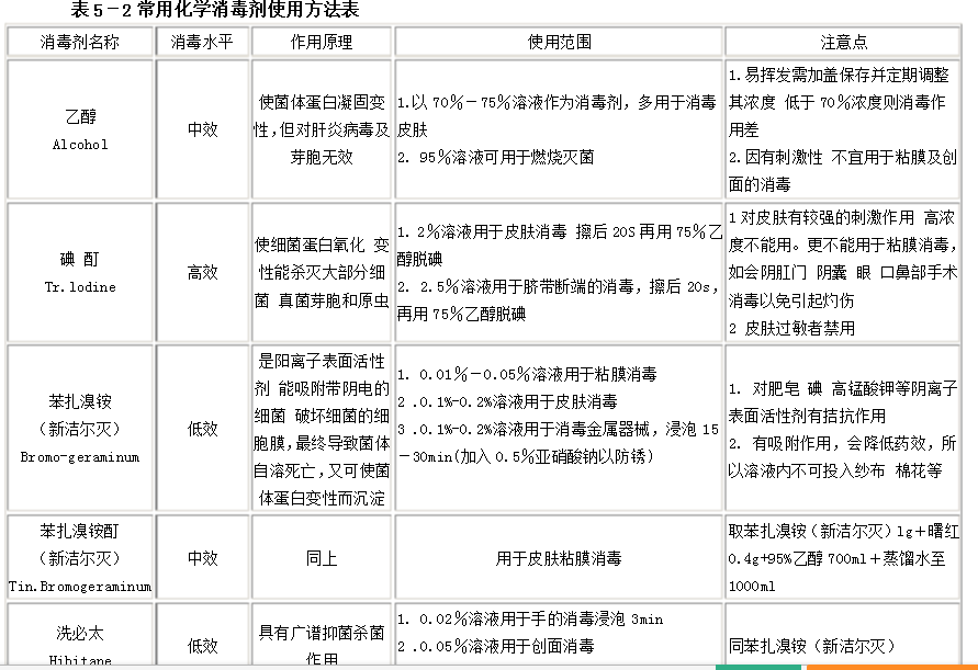 (2)中等水平消毒劑其特點(diǎn)是溶解度好、性質(zhì)穩(wěn)定、能長(zhǎng)期貯存,但不能作滅菌劑。如碘伏、碘酒、乙醇、煤酚皂、高錳酸鉀等。